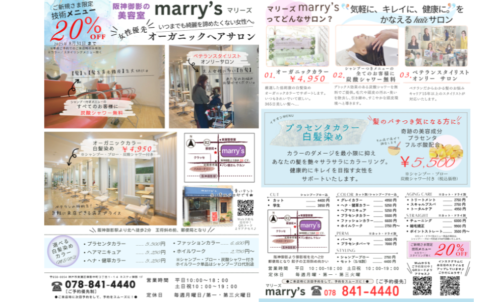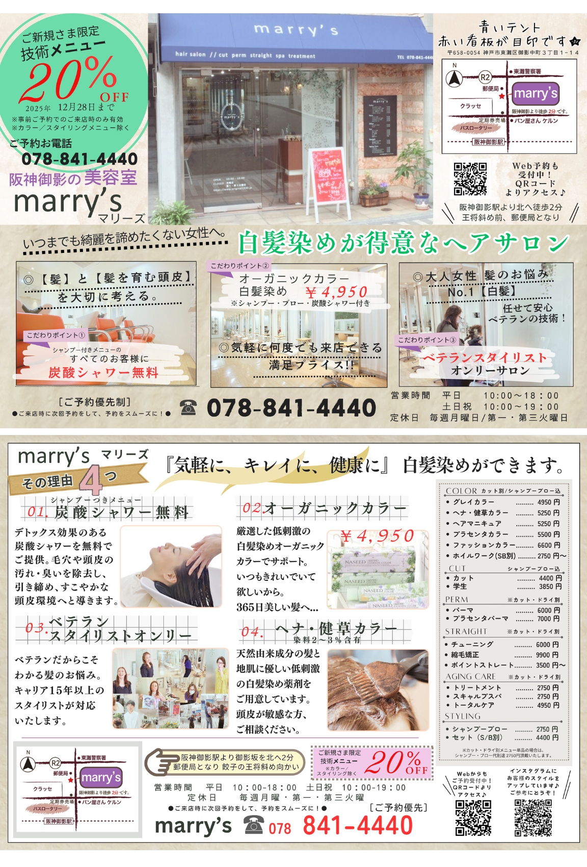 大人50歳からの美容室 いつまでもキレイを諦めたくないあなた(女性)へ。 marry’s(マリーズ)はそんな女性をサポートします。 「気軽に、キレイに、健康に。」を叶えるサロンです。 今月のキャンペーンはこちら Information お知らせ キャンペーン 12月28日まで 2025年10月31日 お客様スタイル 2025年9月6日 キャンペーン 10月19日まで 2025年8月29日 お客様スタイル 2025年8月8日 お知らせ一覧はこちら いつまでもキレイを諦めない marry's(マリーズ)はそんな女性のためのサロンです。 CONCEPT いつまでもキレイでいたい女性へ。厳選したオーガニック薬剤で健康にキレイに。 MENU カラー、カットをはじめパーマ、トリートメントなども対応しております。 STAFF お悩みが増えてくる大人の髪。ベテランスタッフが対応いたします。 Concept 大人サロン3つのこだわり 01 来るたびキレイな髪へ炭酸シャワーサービス シャンプー付きメニューをご利用のすべてのお客様に炭酸シャワーを無料で提供しております。 02 厳選したオーガニック薬剤、自然派薬剤をお取り扱い 健康的にキレイを目指す女性をサポートします。 03 ベテランスタイリストオンリー 経験豊富なスタリストが在籍。大人女性の髪のお悩みに対応します。 詳しくはこちら STAFF スタッフ 岩崎 スタイリスト 山口 スタイリスト 西村 スタイリスト 小林 スタイリスト 吉村 スタイリスト 大嶋 オーナースタイリスト 詳しくはこちら Gallery ギャラリー Access アクセス ADDRESS〒658-0054兵庫県神戸市東灘区御影中町3丁目1-14PHONE078-841-4440OPEN平日10:00-18:00 土日祝10:00-19:00CLOSE毎週月曜日、第一・三 火曜日 電車でお越しのお客様 阪神 「御影駅」から北へ徒歩2分JR神戸線 「住吉駅」から南西へ徒歩9分阪急神戸線 「御影駅」南へ徒歩13分 お車でお越しのお客様 提携駐車場はございません。近隣駐車場をご利用くださいませ。 Online Store 大人の髪のお悩みをケアする お肌が敏感な方や自然派志向の方もお使いいただける厳選したアイテムをご用意。毎日使用するものだからこそ、頭皮・髪のことを大切に考えています。 オンラインストアはこちら