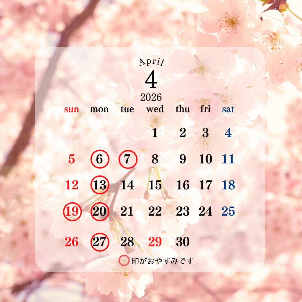 4月の休業日のご案内 毎週月曜第一・三火